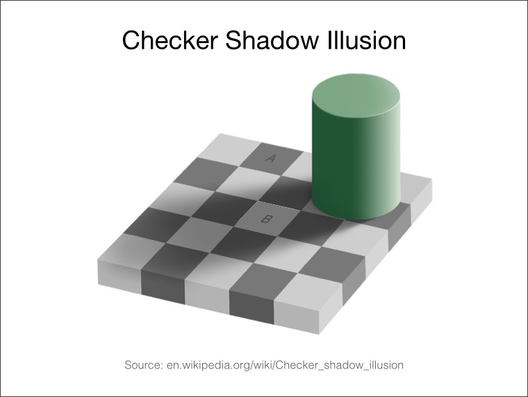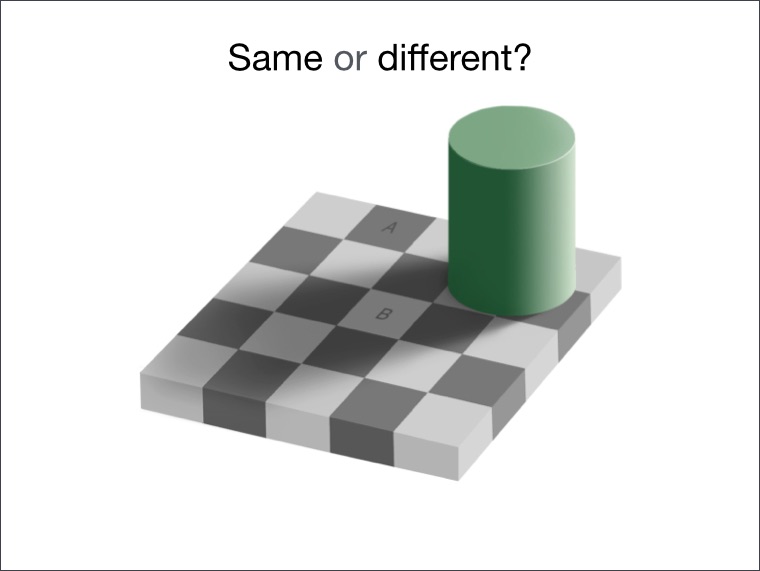 We see block B as lighter than A because various visual cues tell us that B is in shadow.