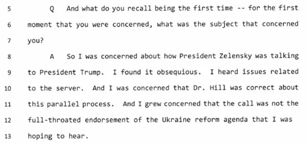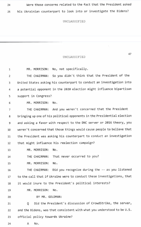 Dan Goldman, the Democrat's counsel says "So just to make sure I understand this correctly, Mr. Morrison, you heard the call, you recognize that President Trump was not discussing the talking points that the NSC had prepared based on official U.S. policy and was instead talking about the investigations that Fiona Hill had warned you about, and then you reported it immediately to the NSC legal advisor. Is that the correct chain of events here?"