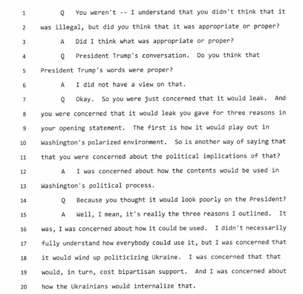 "And you weren't concerned that the President bringing up one of his political opponents in the Presidential election and asking a favor with respect to the DNC server or 2016 theory, you weren't concerned that those things would cause people to believe that the President was asking his counterpart to conduct an investigation that might influence his re-election campaign?
