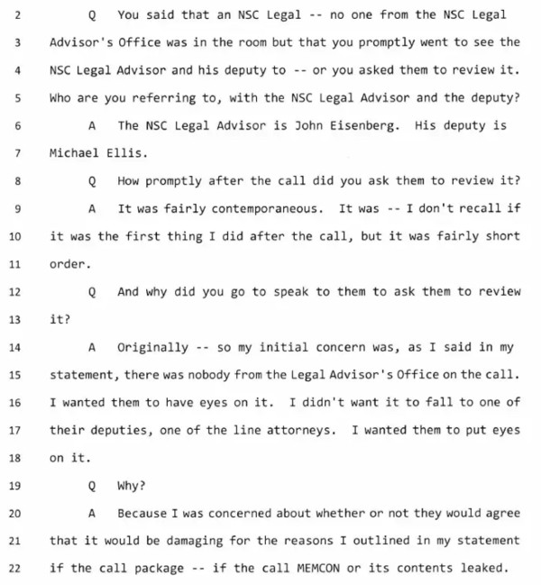 "Why did you go to speak to [NSC Legal Adviser's Office] to ask them to review [the call]?"