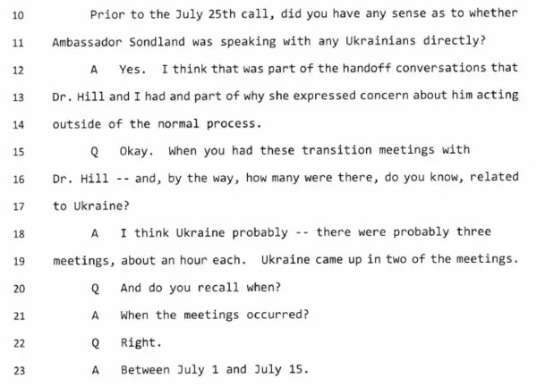 Morrison was asked, "Prior to the July 25th call, did you have any sense as to whether Ambassador Sondland was speaking with any Ukrainians directly?"