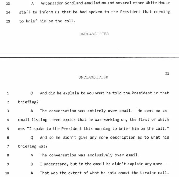 Ambassador Sondland e-mailed me and several other White House staff to inform us that he had spoken to the President that morning to brief him on the call.