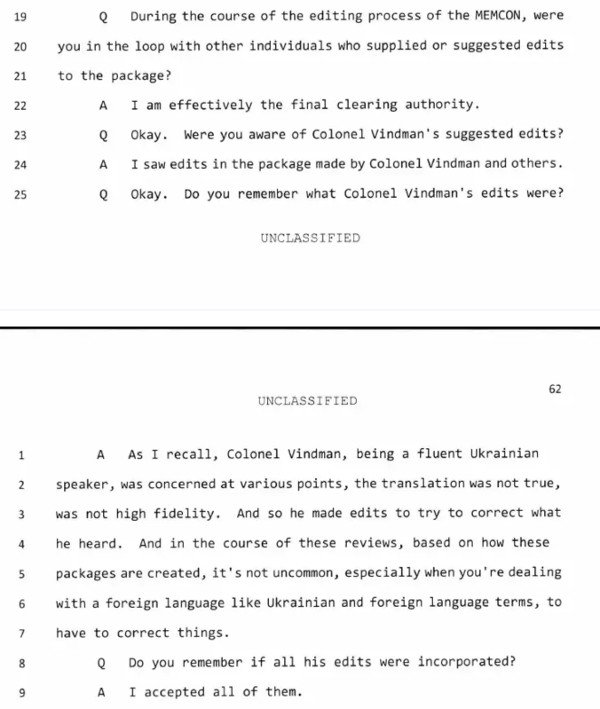 As I recall, Colonel Vindman, being a fluent Ukrainian speaker, was concerned at various points, the translation was not true, was not high fidelity. And so he made edits to try to correct what he heard. And in the course of these reviews, based on how these packages are created, it’s not uncommon, especially when you’re dealing with a foreign language like Ukrainian and foreign language terms, to have to correct things.