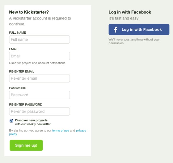 Fill in the account information or log in to Kickstarter using your Facebook account if you have one.