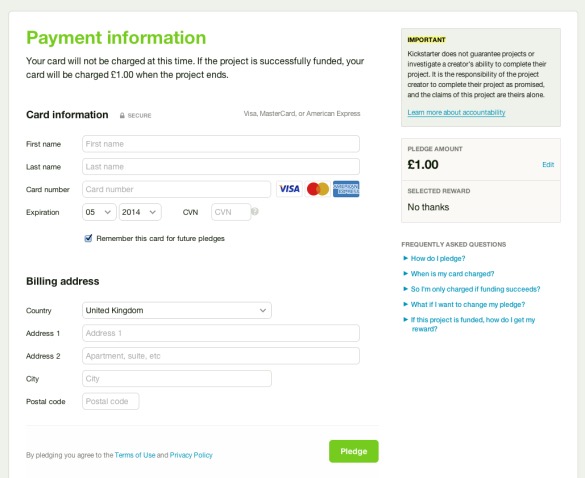This is a step-by-step guide to make your first pledge on Kickstarter [2014]. You will have to register on Kickstarter before you can make your first pledge. I will tell you how to make sure you don't get any unwanted mail from Kickstarter.