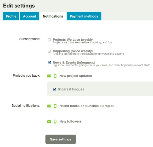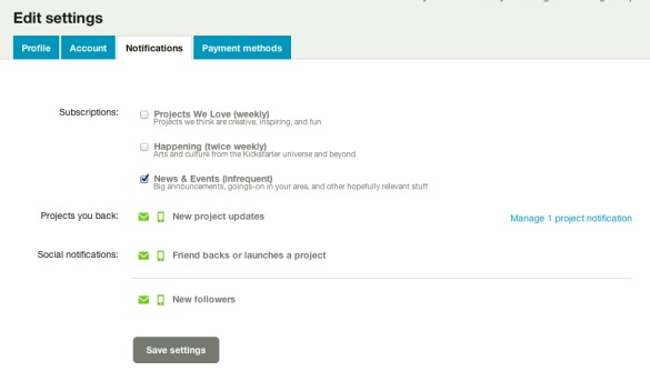 Uncheck or check any notifications you want to receive from Kickstarter and click Save settings.