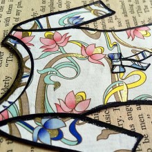 I machine-cut the elements, such as sleeves, collar, cuffs, bow, etc. To make each piece distinct I cut a slightly larger piece from black card to create a crisp black background.