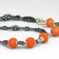 Modern black hematite and orange wire cage necklace set