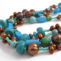 Long necklace of turquoise and copper freshwater pearls