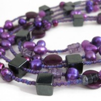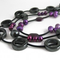 Very long hematite and purple pearl necklace