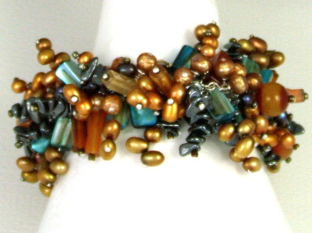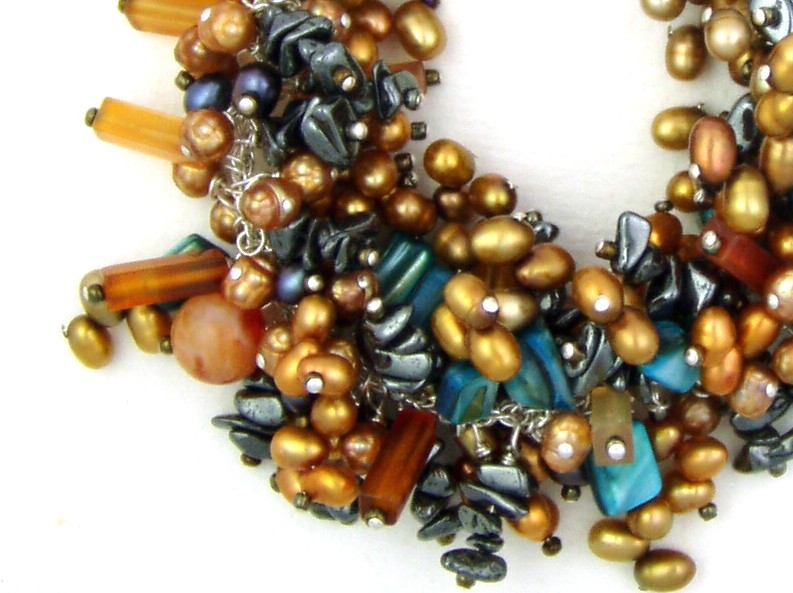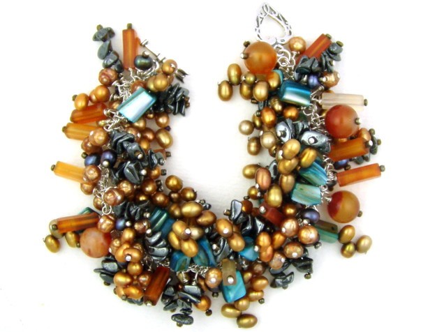 This very full bead-charm bracelet combines semi-precious carnelian gemstone with hematite, freshwater pearls and blue mother of pearl.