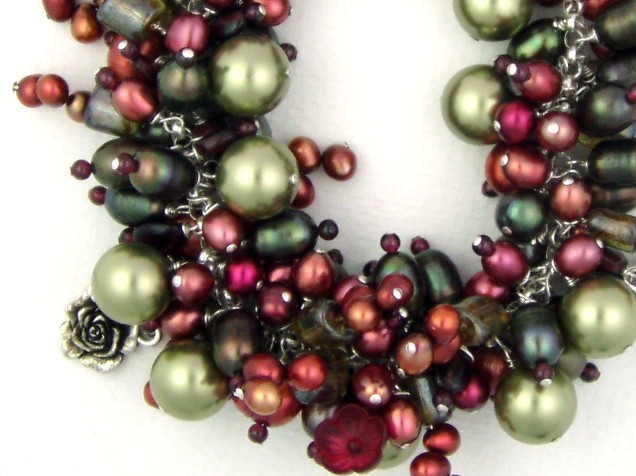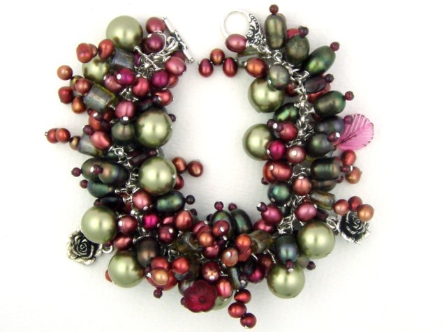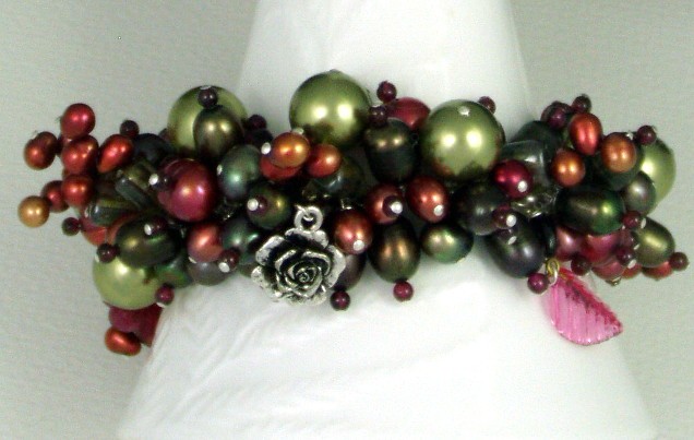 I've matched large freshwater pearls in pinks and greens, Picasso glass, large green Swarovski crystal pearls and raspberry red garnet. It also includes two pewter rose charms, a pink glass leaf and a pink glass flower.