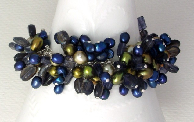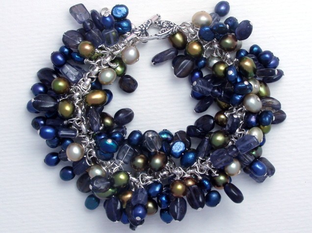 This stunning and very full bead-charm bracelet combines deep blues with greens. I've matched semi-precious iolite gemstone in various shapes and sizes with deep blue, deep green and pale apple green freshwater pearls.