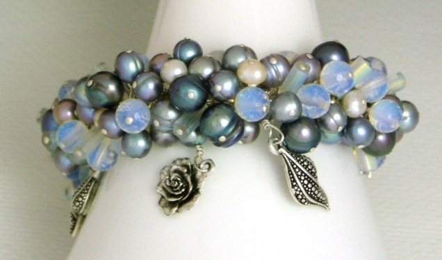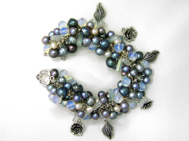 I've combined faceted opalite glass with freshwater pearls in ivory and greys, glass tubes and pewter charms.