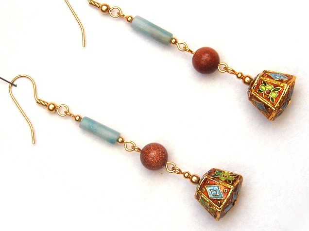 These pretty earrings feature large Chinese cloisonne enamel beads which are copper-coloured and accented with turquoise, two greens and gold colour. They are accompanied by semi-precious amazonite and goldstone beads. The wire and hooks are gold-plated.