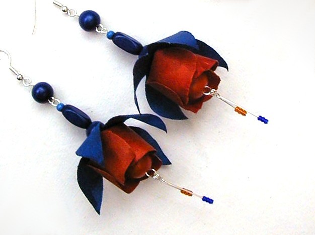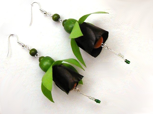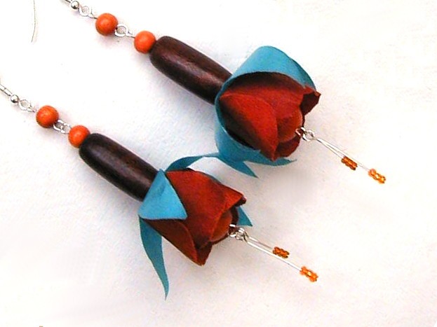 These earrings are in the style of fuchsia flowers. Orange and brown wooden beads form a flower with light turquoise and orange petals made from varnished paper.