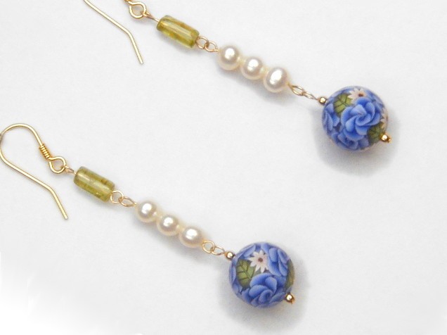 These earrings feature stunning hand-made beads by Catherine Steele. They are covered by gorgeous roses in a soft purpley blue, small white flowers and vignetted green leaves.
