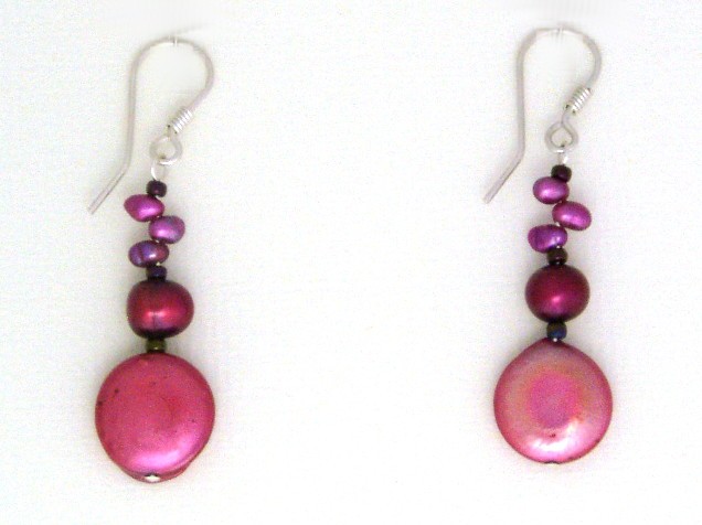 These very elegant earrings combine beautiful pink coin pearls with fuchsia purple and deep rose freshwater pearls. The pearls are separated by tiny glass beads in metallic colours. The wire and hooks are sterling silver.