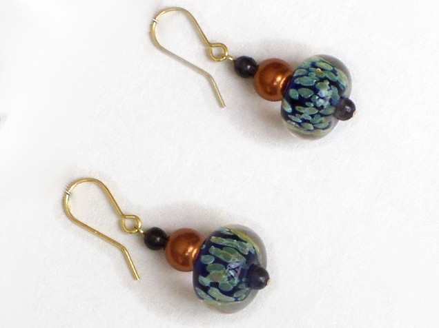 These earrings features boro lampwork beads called Wild Indigo by Brendan Blake. The deep blue core is decorated with opal-coloured petals.