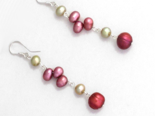 These earrings are made with three colours and sizes of freshwater pearls: soft pink, pale green and peachy pink. The wire and hooks are sterling silver.