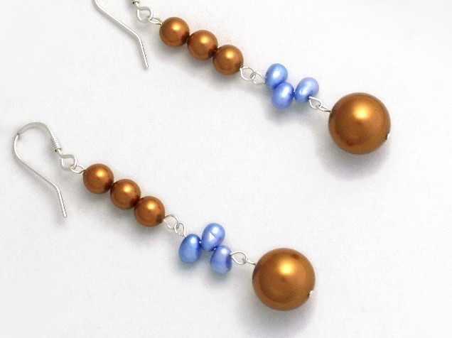 These earrings combine copper Swarovski crystal pearls with trios of baby blue freshwater pearls. The wire and hooks are sterling silver.