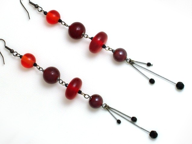 Very long red black, glass and resin earrings