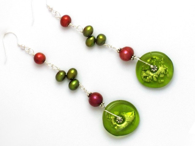 I've matched them with pale blue and brown freshwater pearls, and copper Swarovski crystal round pearls. Also made in green and rose pink.