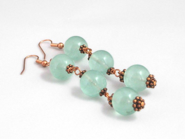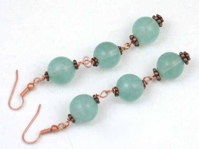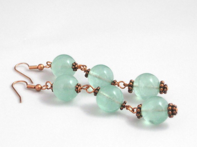 These long and dangly earrings combine luscious green fluorite beads with copper-tone beads, and real copper wire and hooks.