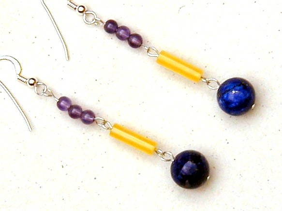 These lovely earrings feature fine-quality lapis lazuli. The rich stone blue beads are contrasted with semi-precious yellow jade and amethyst gemstone beads. The wire and hooks are sterling silver.