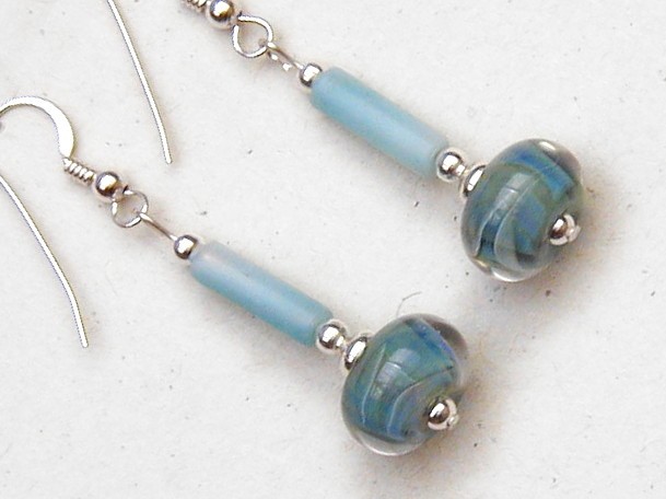 These earrings feature lampwork beads made by Brendan Blake and are called Rainy Day. They are made from high-quality borosilicate glass, clear cased and kiln-annealed for strength and durability. See the second better photo for the actual beads used in these earrings.