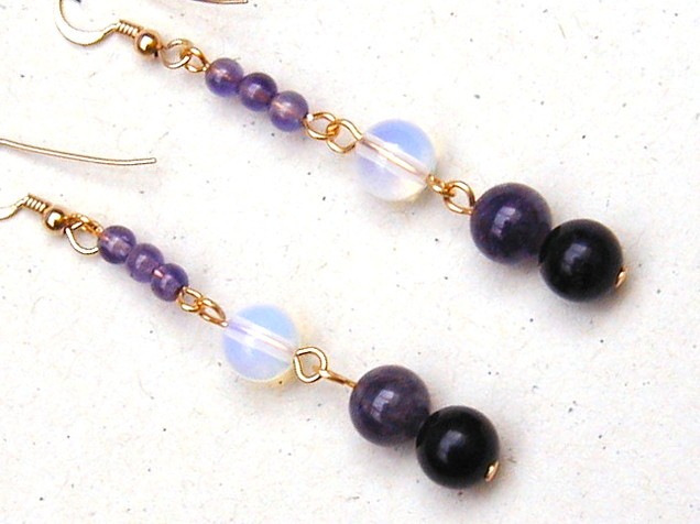 These very elegant earrings are made with semi-precious amethyst and opalite glass rounds. At the top of each earring are three small round amethyst beads. A single opalite glass bead is then followed by two larger and darker amethyst round beads. The wire is gold-plated and the hooks gold-filled.