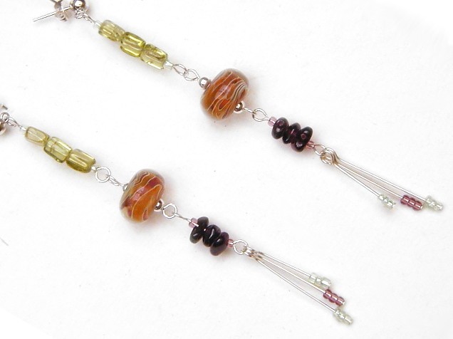 The beautiful lampwork beads are accompanied by semi-precious raspberry garnet and fresh green peridot. Three dangles at the bottom contain small beads in matching colours of mint green and amethyst. The wire is silver-plated; the small silver beads, the studs and butterflies are sterling silver.