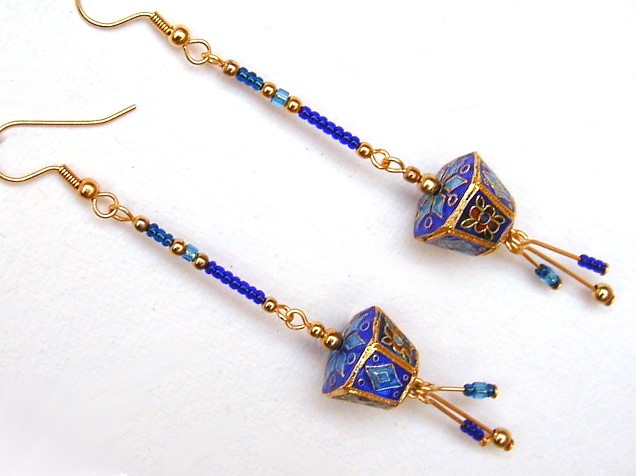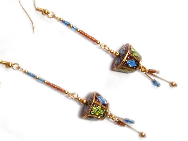 These cute earrings feature large hollow Chinese cloisonne enamel beads which are copper-coloured and accented with turquoise, two greens and gold colour. They are accompanied by small glass and metal beads in matching colours of dark turquoise and orange. The wire and hooks are gold-plated.