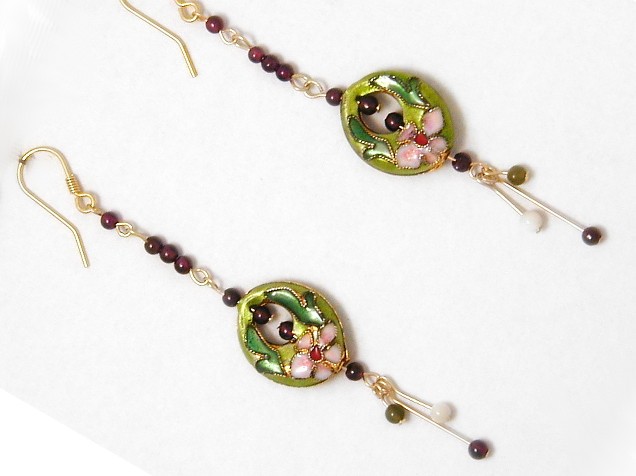 These modern earrings feature hollow enamelled lime green drops with pink flowers and burgundy leaves. They are co-ordinated with semi-precious raspberry garnet, green jade and creamy mother of pearl. The wire is gold-filled and the hooks gold-plated sterling silver.