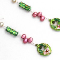 Long green and pink enamel earrings with jade