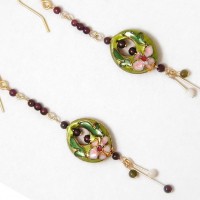 Pretty earrings of green enamel with garnet, jade and mother of pearl