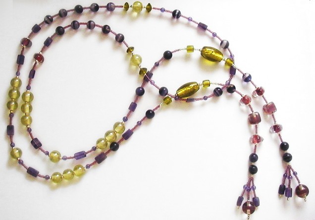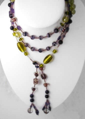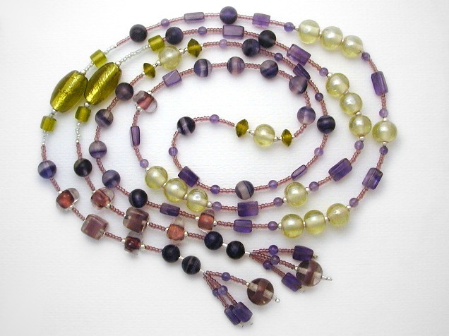 Gorgeous lariat necklace of amethyst, fluorite and hand-made glass