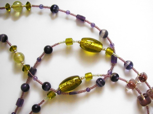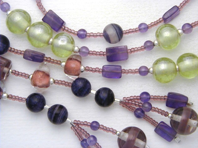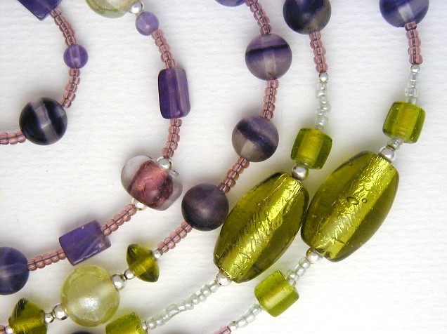 I matched these with various glass beads, mostly hand-made: large oval lime green beads with a lining of real silver foil; triangular beads with rounded edges which have an dusky rose inner colour; square and round clear beads hand-painted with a lilac stripe; soft lime green hand-made round beads with a lustrous finish.