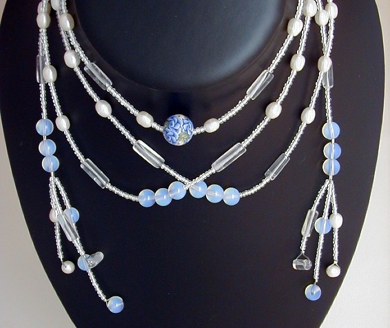 This necklace is all white except for the central polymer clay bead. The white beads are opalite glass which have a pinky blue glow against black, rock crystal tubes, creamy freshwater pearls and tiny white-lined glass beads.