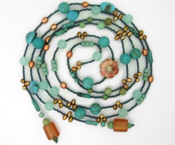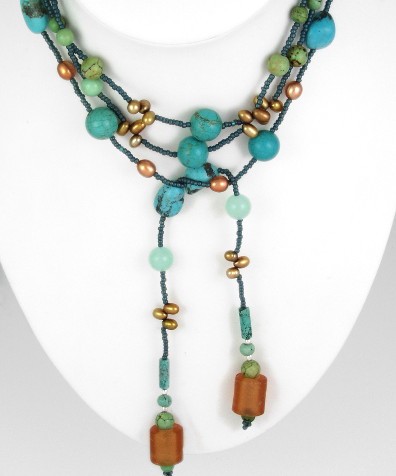 This stunning lariat necklace features semi-precious turquoise beads in six shapes and sizes.