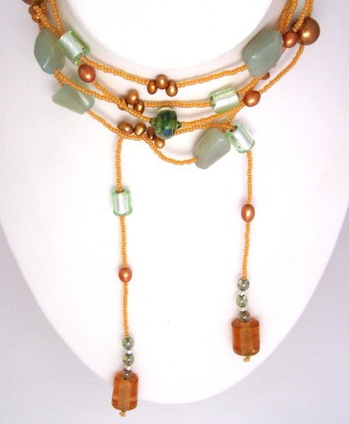 I'm thrilled with how this lariat turned out and kept taking it out to look at. I have had these orange seed beads for a couple of years, not sure what to do with them. I eventually combined them with a soft green and the results are stunning.