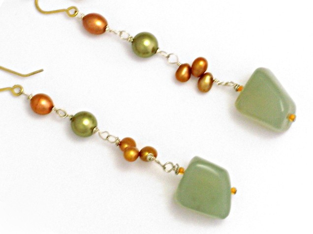 I've matched large soft green chalcedony nuggets with ice-green silver-lined glass, copper freshwater pearls and round Swarovski crystal pearls in green and copper.