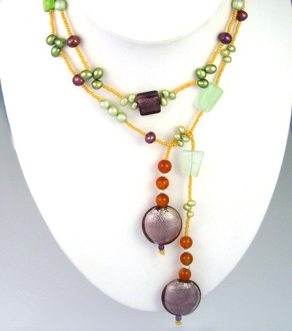 Starting from the ends, the necklace features lilac foil-lined glass with amethyst and orange carnelian rounds.