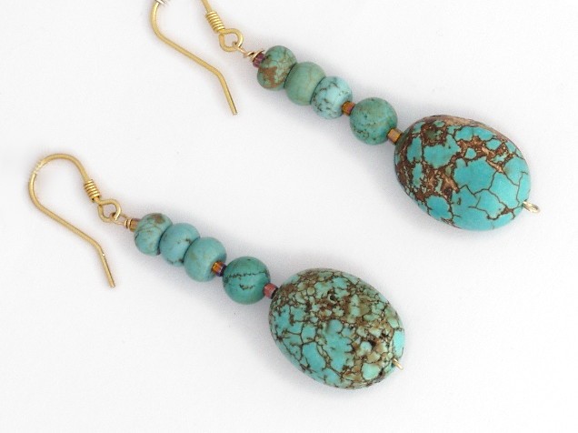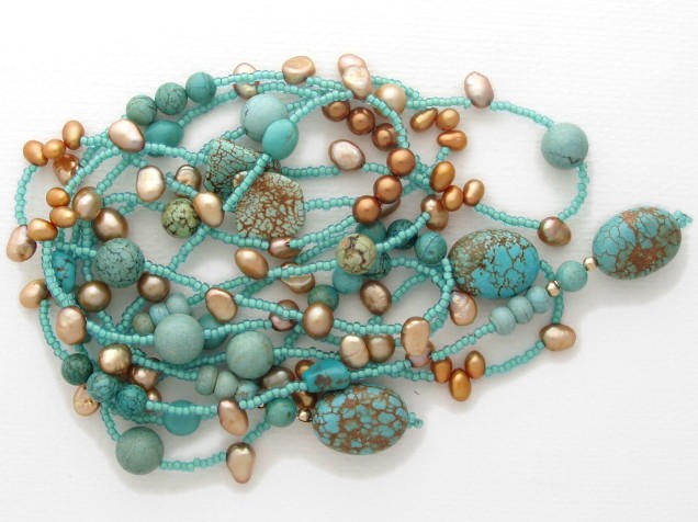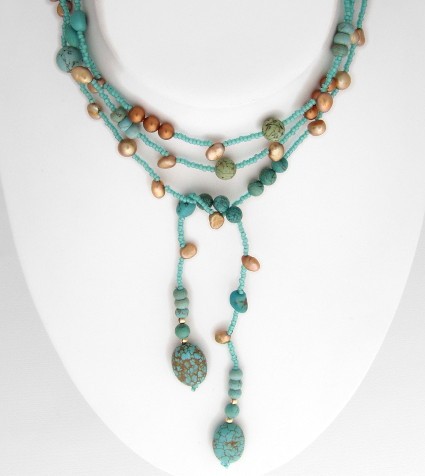 This stunning lariat necklace features semi-precious turquoise beads in various shapes and sizes.