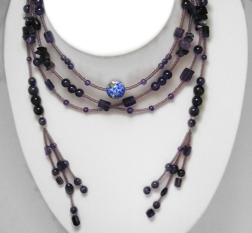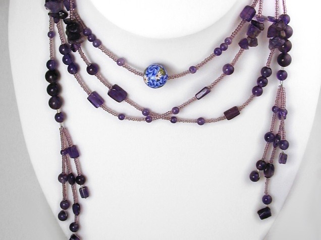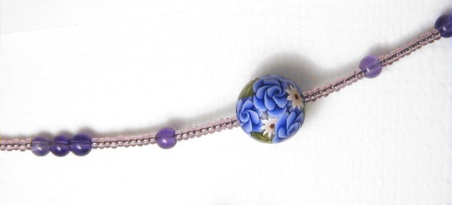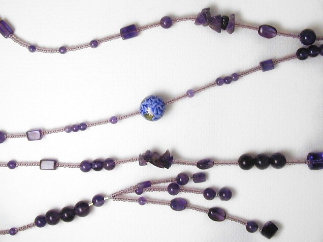 This necklace is made mostly from semi-precious amethyst beads in various shapes and sizes. The central bead is a gorgeous polymer clay bead. The main beads are separated by tiny lavender glass beads.