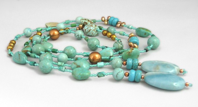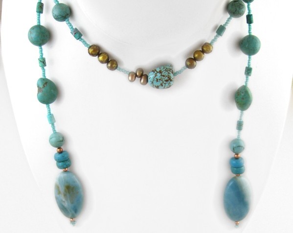 This elegant lariat necklace set combined blue turquoise and amazonite with copper in the form of Swarovski crystal pearls and freshwater pearls.