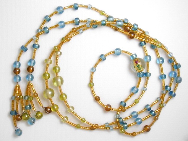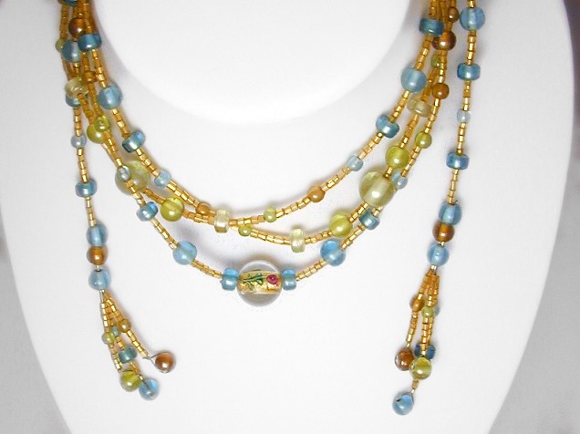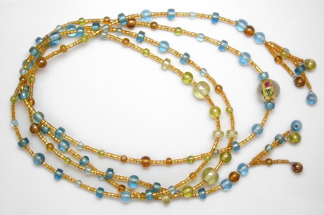 I've matched the lustered beads with small gold-colour glass tubes; they really show off the blues and greens of the other beads.