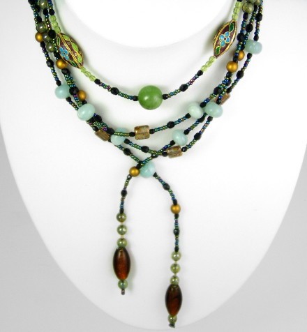 I've matched the amazonite and peridot with enamel and various glass beads. The enamelled beads are decorated in abstract and floral patterns in turquoise, emerald green and lime green against a warm brown background.