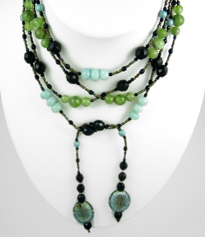 This stunning lariat combines peridot rounds with amazonite. They've been matched with black and gold glass.