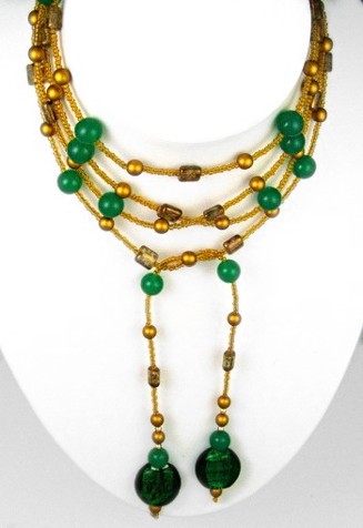 I've matched the green beads with matt gold rounds and Picasso glass pillows, beads with a special lustrous coating. I've used green foil-lined glass discs at the ends of the lariat and the main beads are separated by tiny orange glass beads.